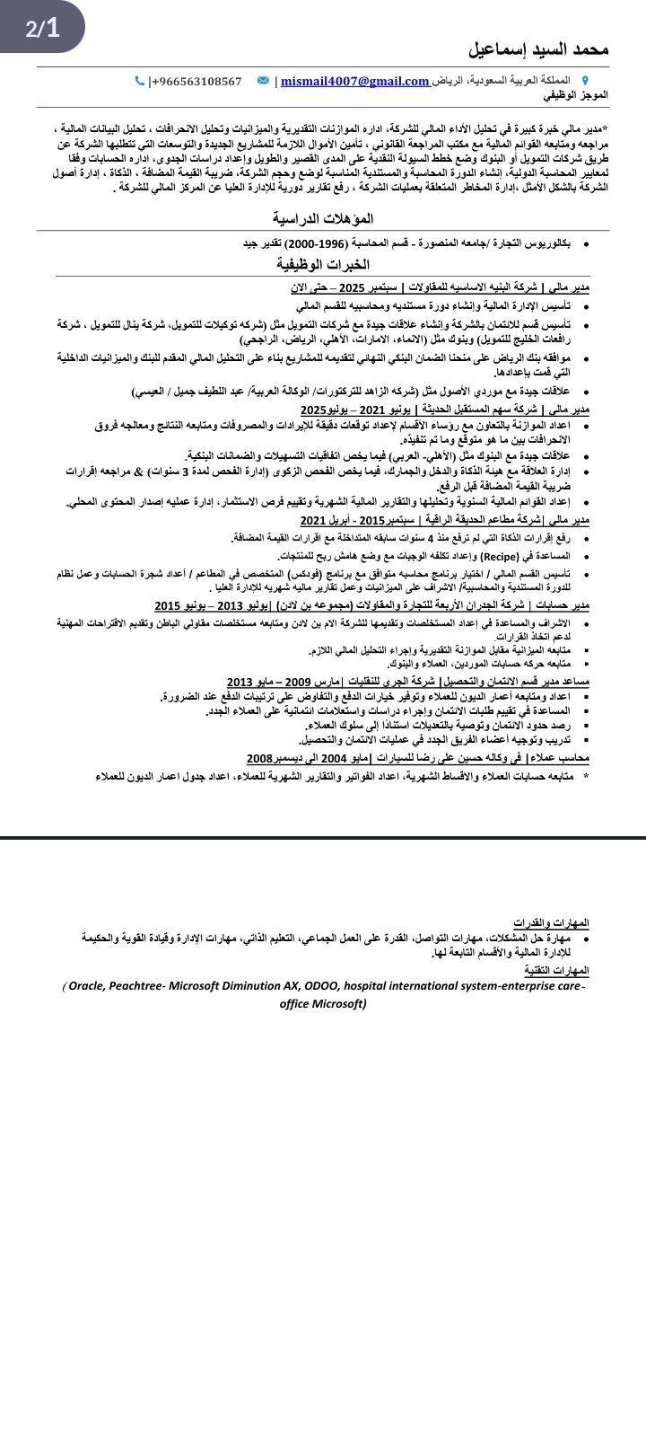 Financial and administrative manager with 24 years of experience in financial management and its establishment, experience in financial statements and financial analysis, experience with many accounting programs, experience in submitting Zakat declarations and value - added tax declarations, working on many accounting programs in addition to many experiences in other administrative departments. Riyadh