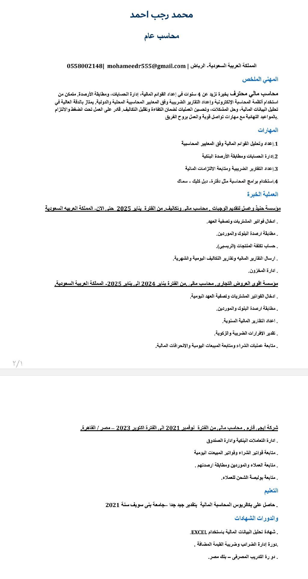 محاسب عام بخبرة تزيد عن 4 سنوات في اعداد القوائم المالية والتقارير الضريبية وإدارة الحسابات ومطابقة الأرصدة البنكية. متمكن من استخدام الأنظمة المحاسبية مثل دفترة وسماك، ولدي خبرة عملية في شركات سعودية ومصرية بمجال المشتريات، التكاليف، واعداد الميزانيات. ابحث عن فرصة عمل لتوظيف خبرتي بدقة والتزام لتحقيق أهداف المنشأة