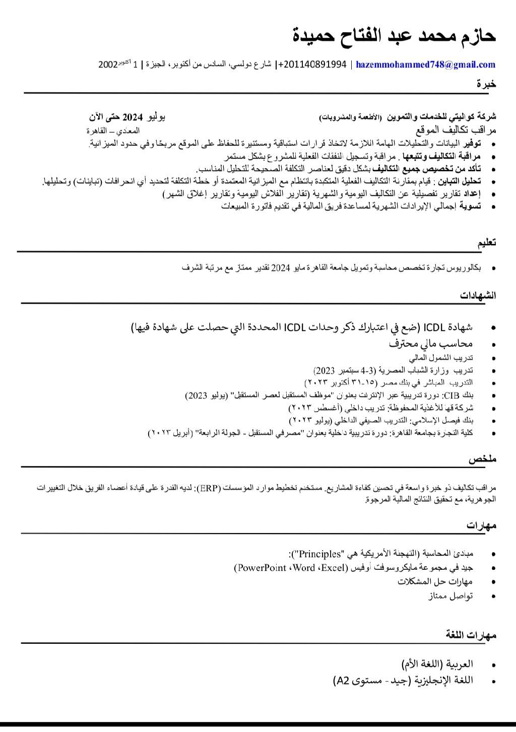 محاسب تكاليف مطاعم خبرة سنة و8 شهور المهام التي أقوم بها هي مراقبة مخزون واستلامات يدوي و ع سيستم وصلاحيات منتجات والصرف وتحديد مكونات وتكلفة الوجبات واخرج مواد الخام بناء علي إيراد اليوم وتحديد كميات التي تخرج من كل صنف ورقابة عليه وتحديد تكلفة مباشرة وغير مباشرة وتحديد معدل دوران المخزون وانحراف أسعار والتحليل وجبات اليوم وتحليل الأصناف التي تخرج من المخزن وصرف موقع ERP system وتقفيل تكلفة الشهر