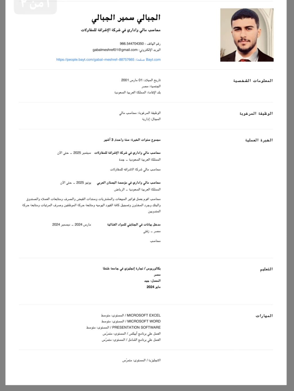 محاسب حديث التخرج حاصل علي بكالوريوس محاسبه انجليزي قادر علي مباشرة العمل علي الفور أينما وجد إقامة سارية وقادر علي أداء المهام المحاسبية بكل دقة وسرعة واصدار التقارير المحاسبية السليمه قادر علي متابعة العملاء وسندات الصرف والقبض متابعة حركة المبيعات والمشتريات وحركة الصندوق ومراقبة البنوك والمخزون اصدار التقارير الضريبيه