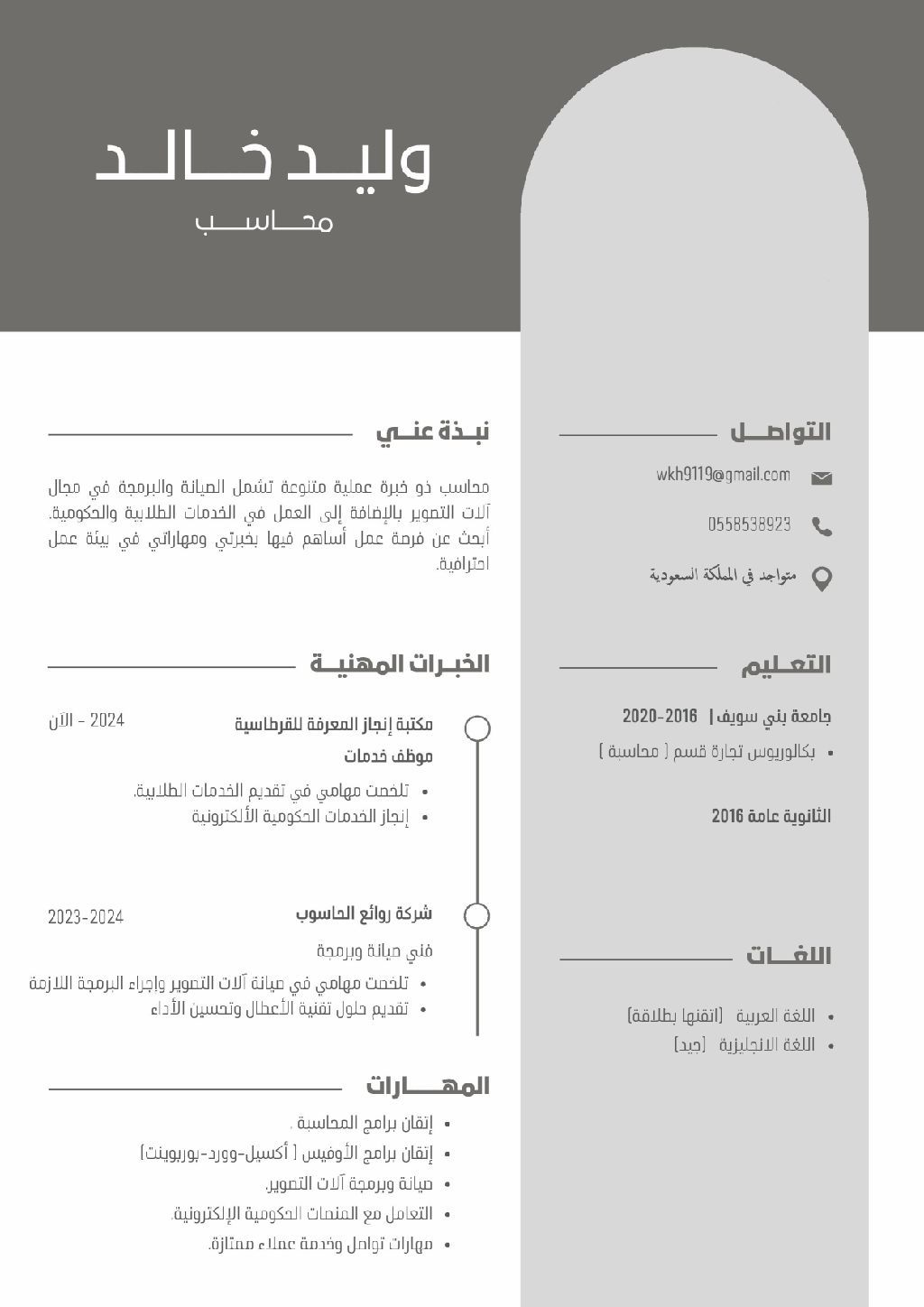 محاسب حاصل على بكالوريوس تجارة ابحث عن فرصة عمل خبرة 3 سنوات بالمملكة اشتغلت خدمات طلاب وخدمات حكوميه. وملم بالأساسيات المحاسبية واعداد القيود والتقارير المالية. أجيد استخدام الحاسب الآلي وبرامج الأوفيس Excel والورد