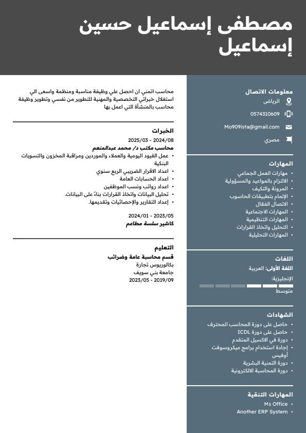 محاسب حديث التخرج مصري حاصل على بكالوريوس تجارة اجادة في استخدام البرامج المحاسبية إقامة سارية حاصل على دورة المحاسب المحترف حاصل على دورة أكسيل اشتغلت محاسب في مستودع مواد غذائية واشتغلت في شركة مقاولات في الرياض اشتغلت محاسب في مؤونة الاقتصادية
