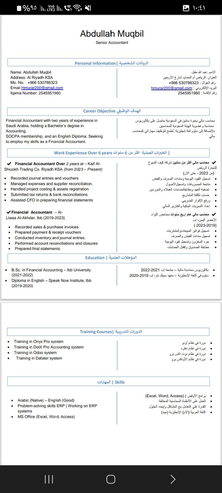 محاسب مالي يمني حاصل على بكالوريوس محاسبة وخبرة أكثر من 4 سنوات عضوية سارة في الهيئة السعودية للمحاسبين، وحاصل على دبلوم لغة انجليزية. أجيد استخدام البرامج المحاسبية وبرامج الأوفيس اكسل وورد واعداد والتقارير المالية ورفع الاقرارات الضريبي ابحث عن فرصة عمل مناسبة متواجد في الرياض