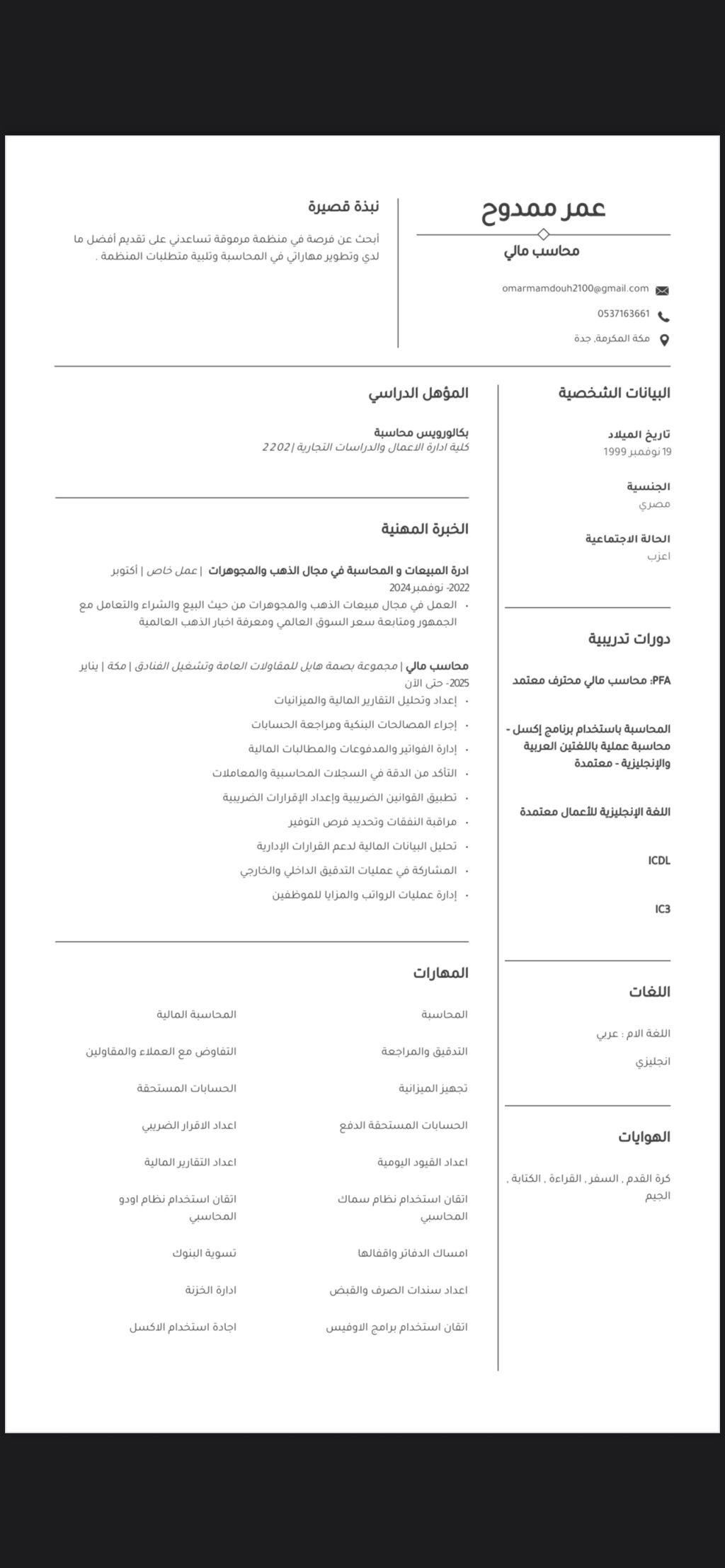 محاسب مصري خبرة سنة بمجال الفنادق والمقاولات في مكة المكرمة (عمل الاقرار الضريبي والتسويات البنكية وتسوية حسابات العملاء والموردين والمقاولين وتجهيز الميزانية) لدي رخصة قيادة وعضوية في هيئة المحاسبين والمراجعين السعودية وإقامة سارية ابحث عن فرصة عمل محاسب جاهز للتنقل الى أي مكان بالمملكة