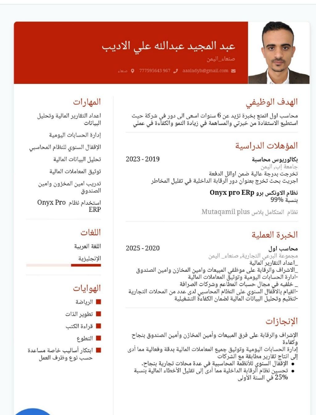 أنا لدي بكالوريوس محاسبة وشهادة خبرة 5 سنوات من العام 2020 اعمل محاسب عمل ولدي شهادة أنظمة محاسبة عديدة مثل الأونكس برو والمتكامل بلاس والصراف المتقدم اشتغلت في عدة مجالات بالمحاسبة مثل اعداد التقارير المالية الشهرية والسنوية والأقفالات السنوية وادخال القيود وسندات الصرف والقبض والتسويات البنكية وادارة الحسابات اليومية وتوثيق وأرشفة السندات واعداد قيود المرتبات والإيجارات وخلفية كبيرة بمجال المطاعم
