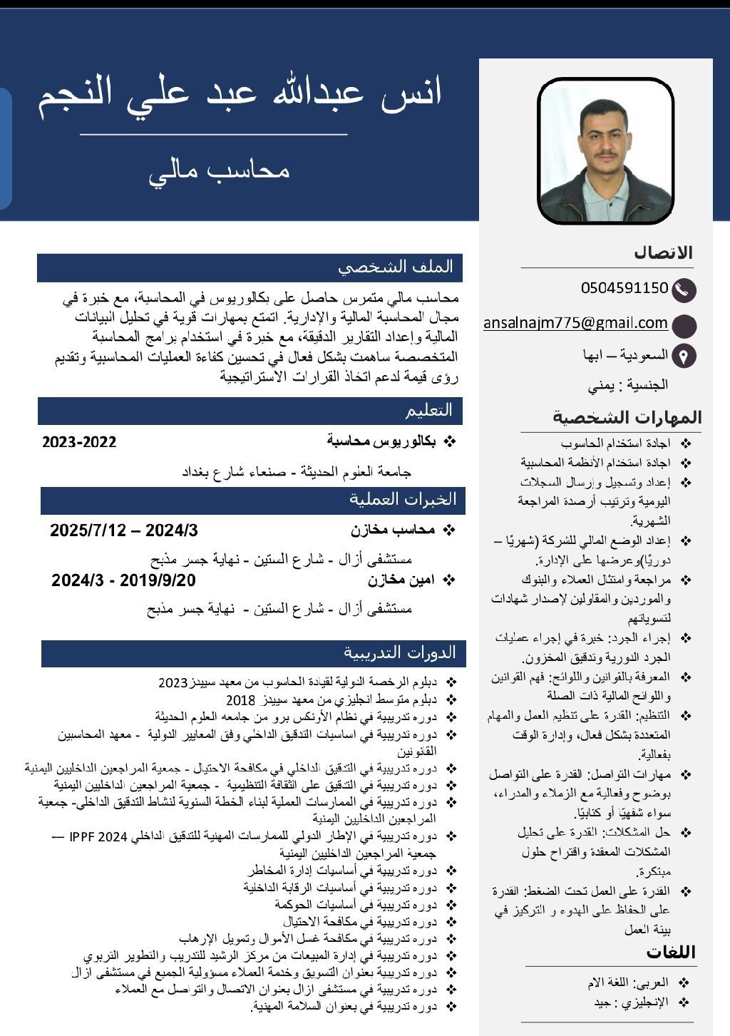محاسب يبحث عن عمل في مجال الاختصاص محاسب كاشير أمين مخازن مبيعات