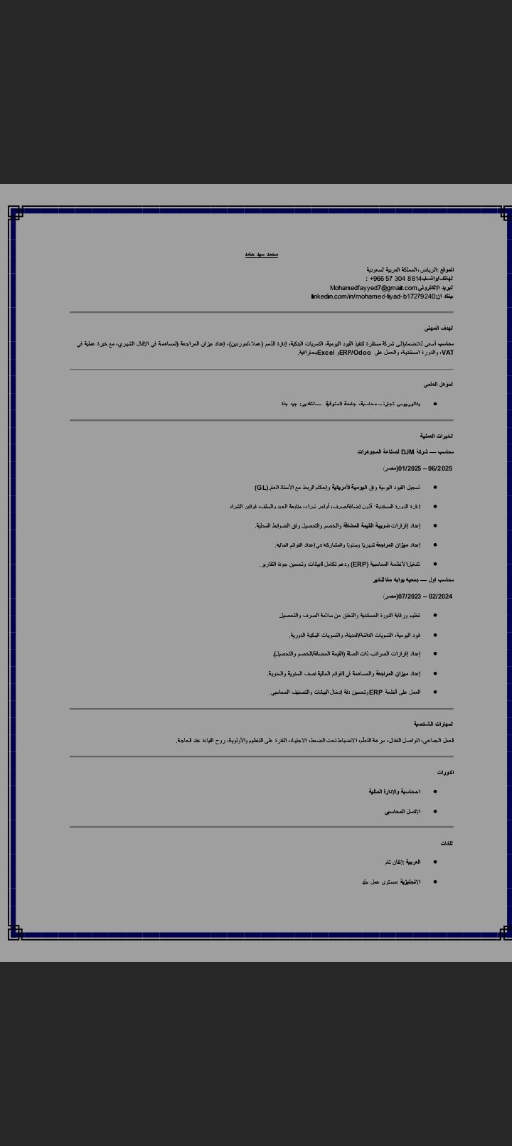 أنا محمد سيد حامد، وأنا حاليا متواجد داخل المملكة العربية السعودية، وابحث عن فرصة عمل في مجال المحاسبة أنا مستعد للانضمام فورا، وابحث عن بيئة عمل احترافية أتمكن فيها من تقديم أفضل ما لدي والمساهمة في تحقيق أهداف الفريق. يسعدني تلقي أي ترشيحات أو توصيات، أو مشاركتكم للمنشور لدعمه في الوصول الى المهتمين