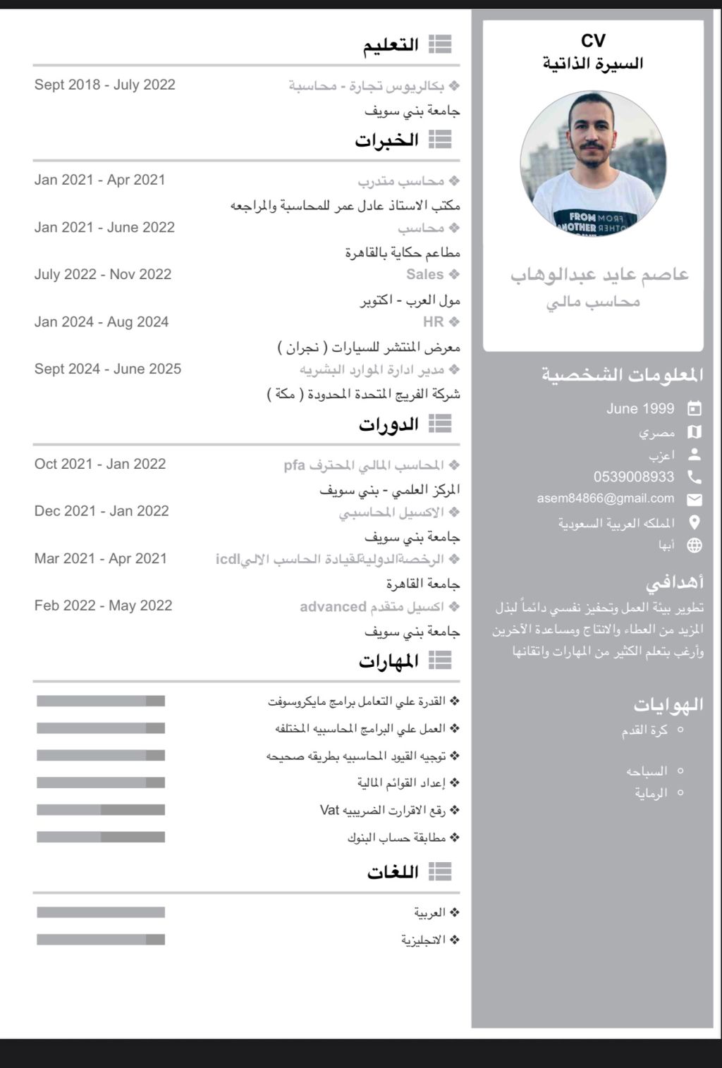 محاسب مالي اعمل بدقة واهتمام بالتفاصيل، لدي خبرة في تسجيل المعاملات المالية واعداد القوائم المالية وحساب الميزانيات. أحرص دائما على التنظيم والالتزام بالأنظمة المحاسبية لتحقيق الدقة والشفافية في العمل