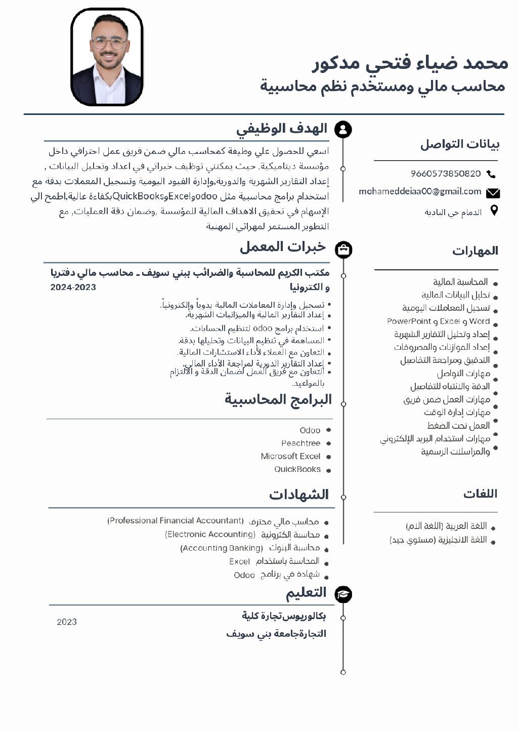 محاسب مصري حديث التخرج متواجد في الدمام حاصل على شهادة بكالوريوس تجارة شعبة محاسبة مالية سنة 2023 وحاصل علي دورات في اكسل وأودو وكويس بوكس وابحث عن عمل
