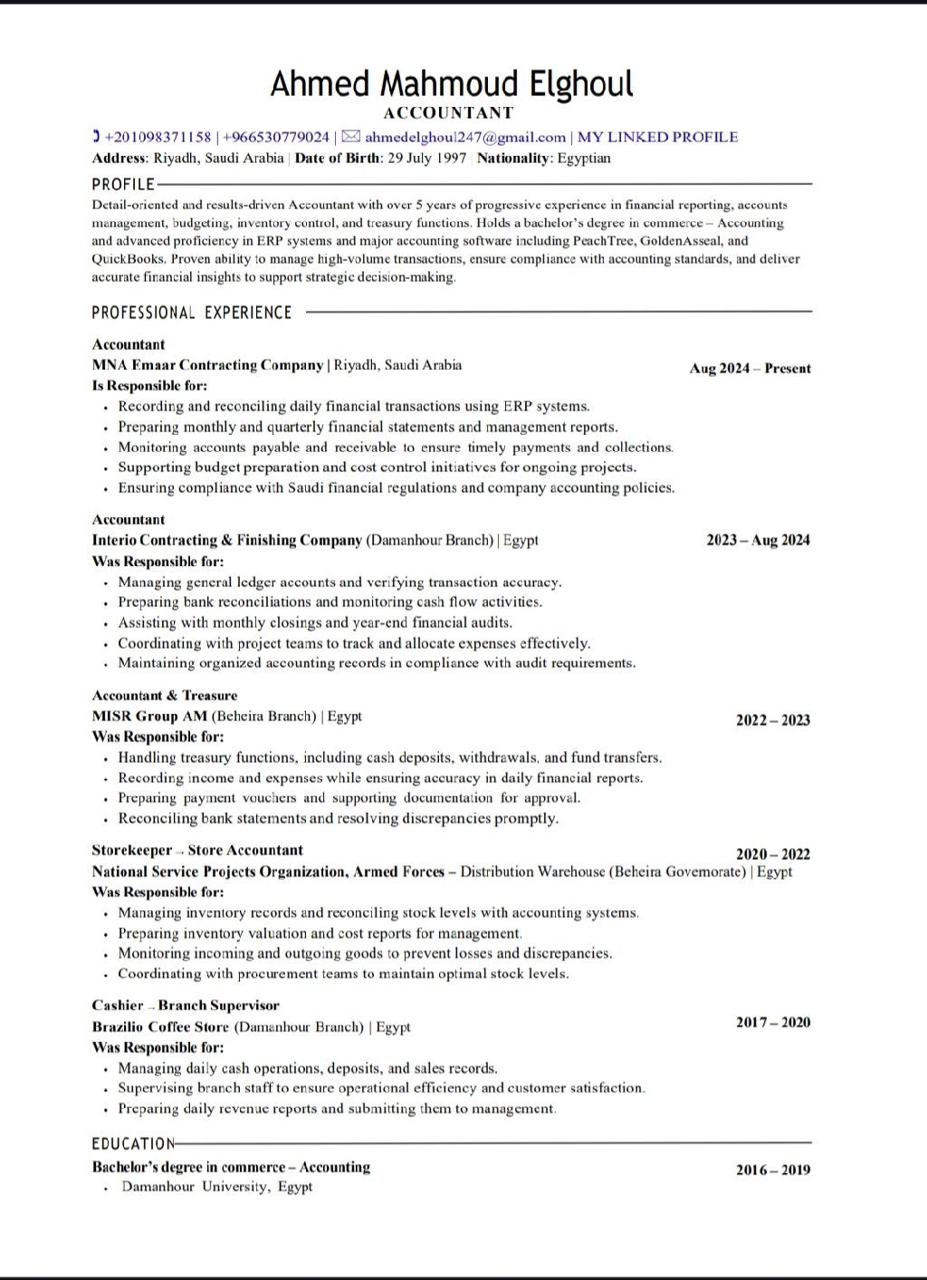 أنا محاسب خبرة 5 سنوات، منهم 1 سنة في السعودية، أنا حاليا في الرياض، ابحث عن نقل كفالة أو تأشيرة للذهاب لمصر والعودة على الشركة في أقرب وقت، وسوف ارفق سيرتي الذاتية بها كل التفاصيل كاملة