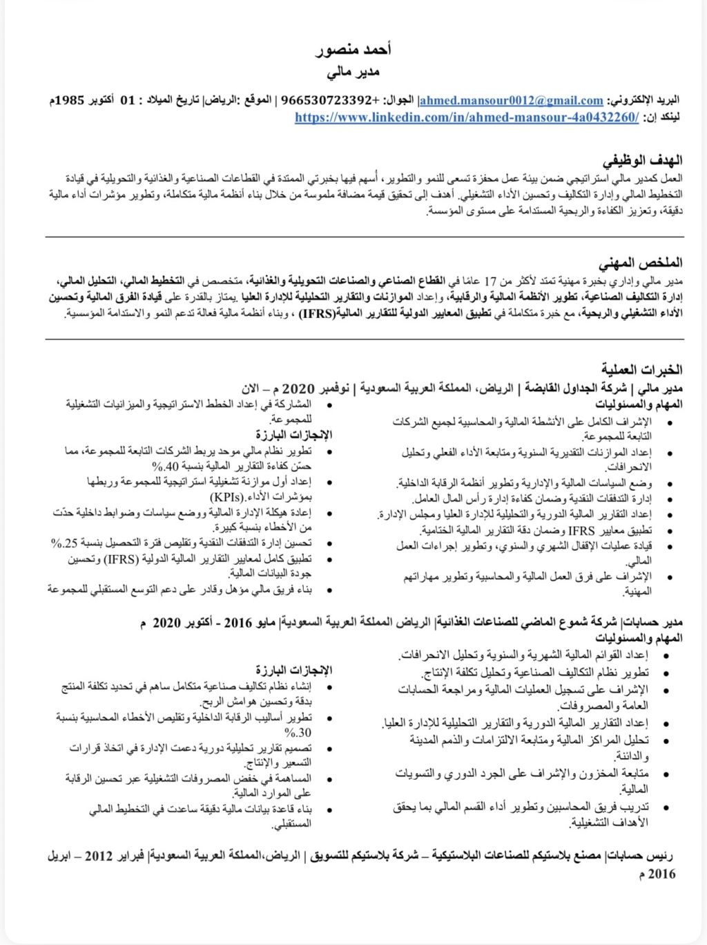 مدير مالي أو مدير حسابات خبرة أكثر 17 عاما بالقطاع الصناعي والتجاري والغذائي