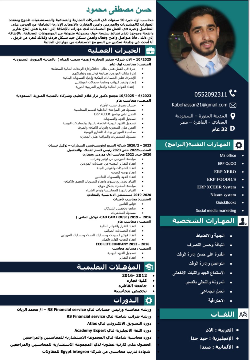 محاسب ابحث غن عمل بدوام جزئي أو عن بعد بخبرة تتجاوز 10 سنوات في الشركات التجارية والصناعية والطبية، ومتقن للعمل على أنظمة أل Odoo ERP واعداد التقارير المالية والتقفيل الضريبي بدقة عالية. أقدم خدمات المحاسبة والاشراف المالي بدوام جزئي أو عن بعد، مراجعة وتقييد العمليات المحاسبية - التقفيل الضريبي واعداد الاقرارات - متابعة الحسابات والموردين والعملاء