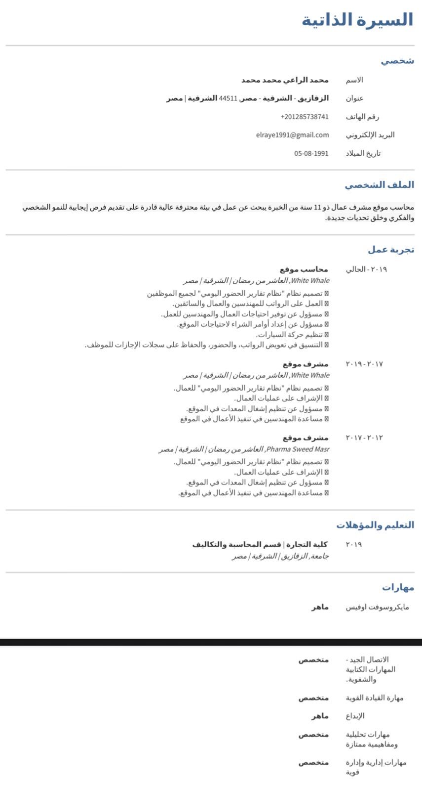 محمد الراعي مصري الجنسية محاسب موقع مشرف موقع محاسب عام حاصل على كلية التجارة قسم المحاسبه والتكاليف لدي خبرة كافية 11 سنة ابحث عن عمل في بيئة احترافية موجود حاليا في مصر محتاج أي فرصه سفر تكون مناسبة لي ومستواي المعيشة