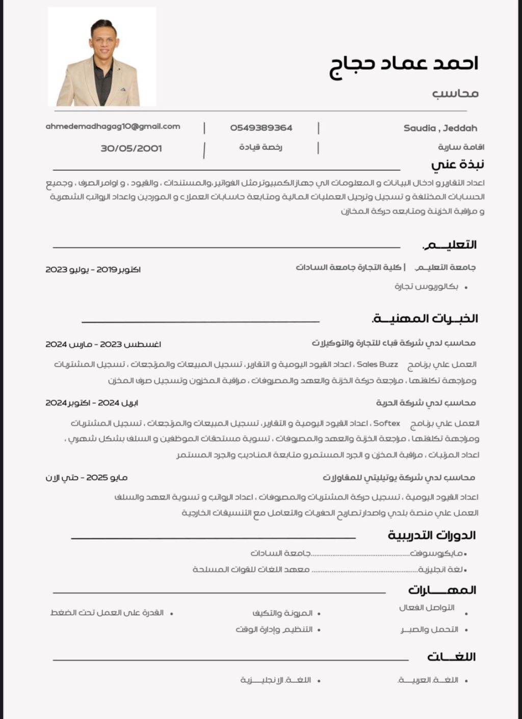 محاسب مصري متواجد في جدة ابحث عن فرصة عمل