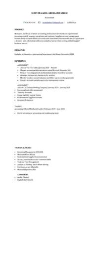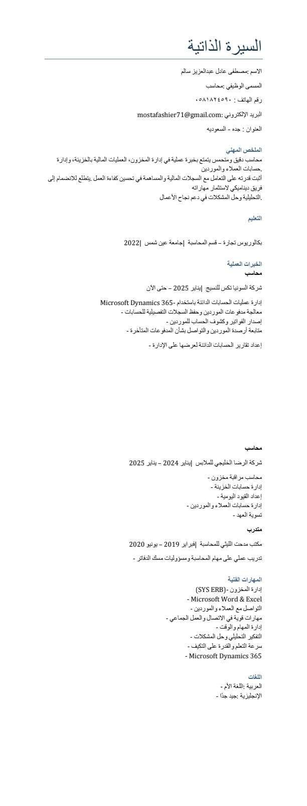 أنا محاسب مالي خبر سنتين في مجال المحاسبه وخبرة في حسابات العملاء والموردين ومراقبه المخزون واعداد الرواتب الشهريه واعداد القيود اليوميه