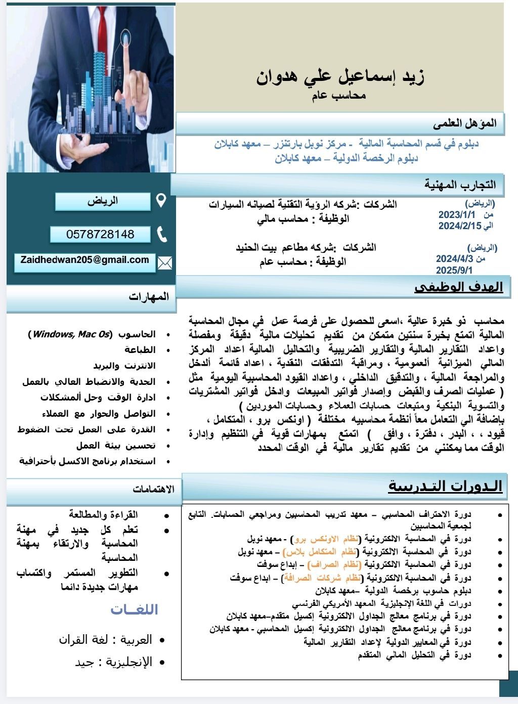 محاسب عام يمني، العمر 23 خبرة 3 سنوات في ادارة قسم الحسابات اعداد الدليل المحاسبي والدورة المستندية العمل علي البرامج المحاسبية قيود ووافق ودفتره وبرامج الأوفيس الاكسل والوورد واعداد القوائم الماليه والاقرارات الضربيبه والزكوية وخبرة في التحليل المالي واعداد الخطط الماليه وفي حساب نقطة التعادل والتكلفة والربح ومراقبه الأصول والالتزامات