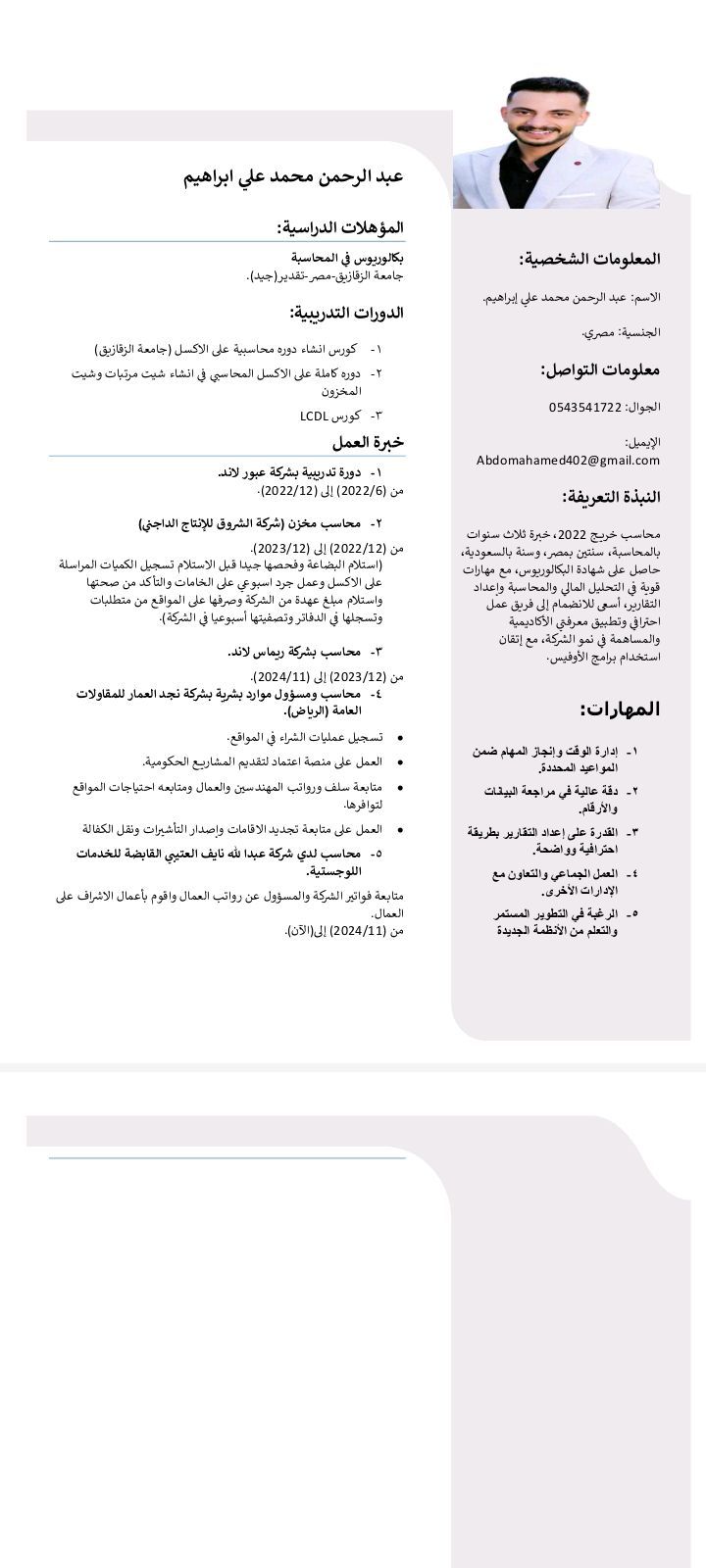 محاسب مصري وابحث عن عمل خبرة سنة في شركة مقاولات وشركة لوجستي