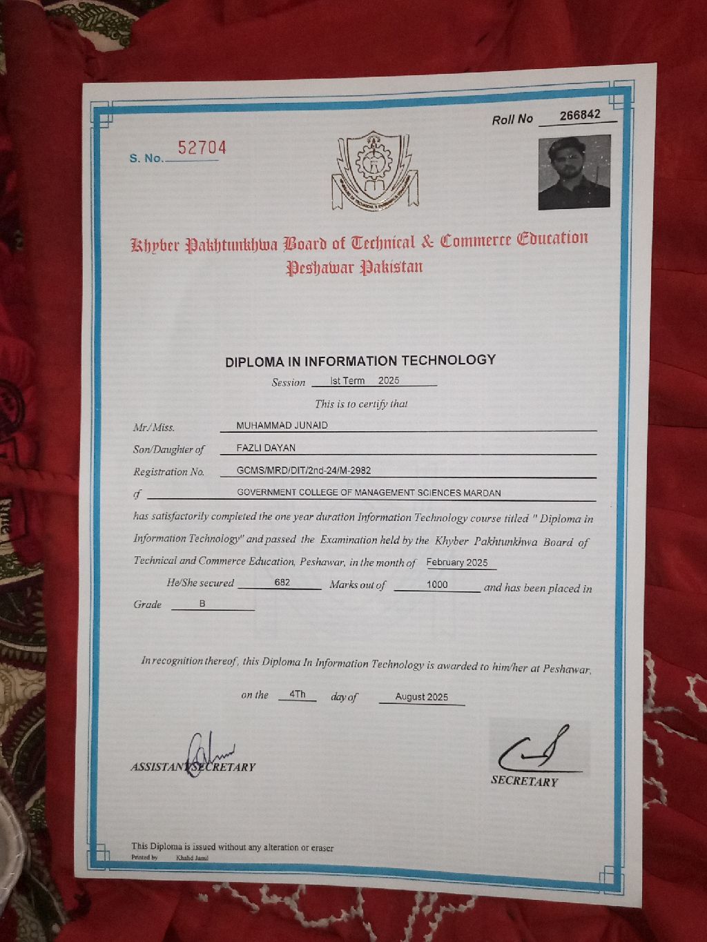 My qualification I am educated my experience 4 years old and my education metric pass and FSC pass I have a diploma of DIT