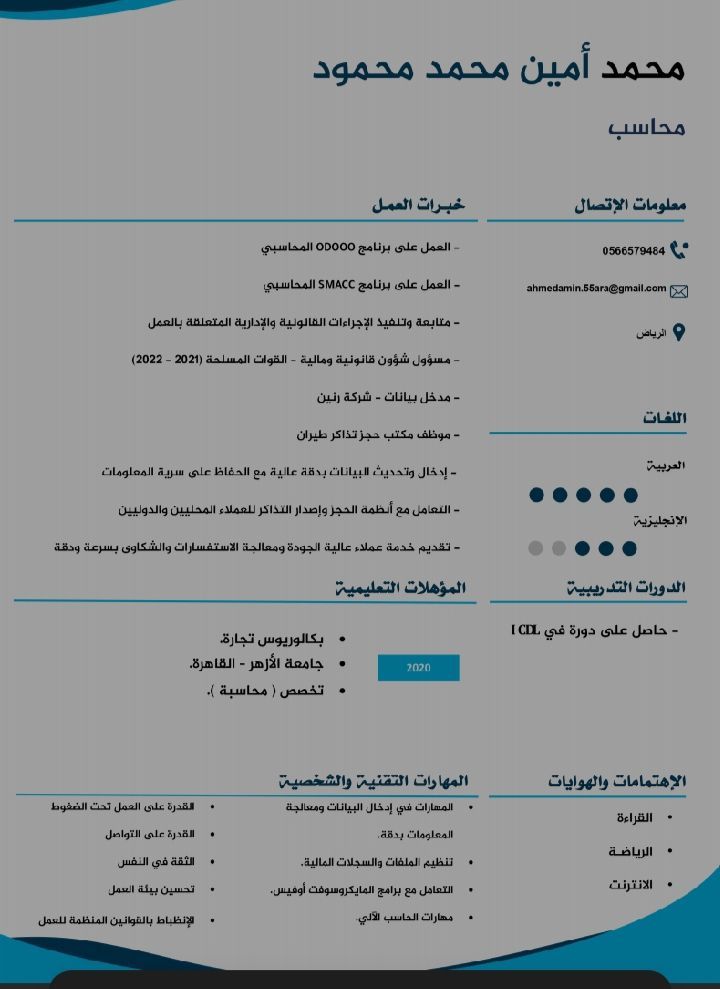 ابحث عن فرصة عمل محاسب لدي خبرة في متابعة وادخال العمليات المحاسبية والدورة المستندية الكاملة بدقة أجيد العمل على الأنظمة المحاسبية Odoo وQoyod، وبرامج Microsoft Office، بالاضافة الى التعامل مع نظام نقاط البيع Foodics لإدارة المبيعات والمخزون إقامة سنة، مقيم الدمام خبرة سنتين ومتاح لنقل الكفالة. رقم الجنسية مصري كلية تجارة جامعة الأزهر