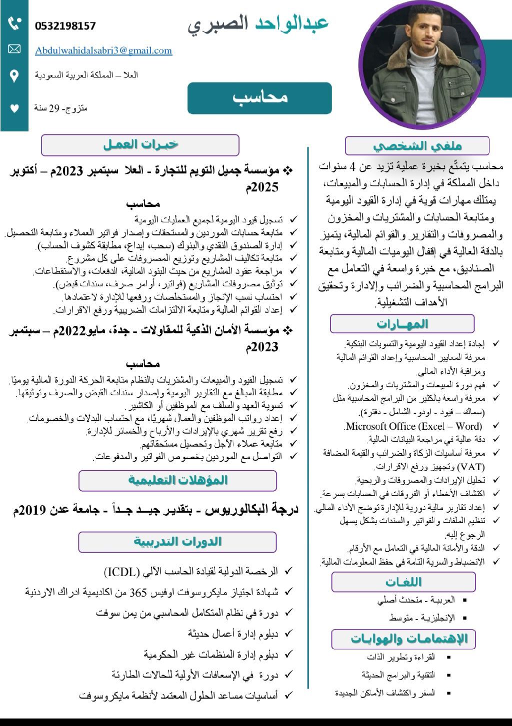 محاسب يتمتع بخبرة عملية تزيد عن 4 سنوات داخل المملكة في إدارة الحسابات والمبيعات، يمتلك مهارات قوية في إدارة القيود اليومية ومتابعة الحسابات والمشتريات والمخزون والمصروفات والتقارير والقوائم المالية، يتميز بالدقة العالية في أقفال اليوميات المالية ومتابعة الصناديق، مع خبرة واسعة في التعامل مع البرامج المحاسبية والضرائب والا دارة وتحقيق الأهداف التشغيلية