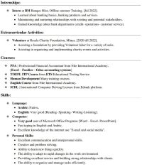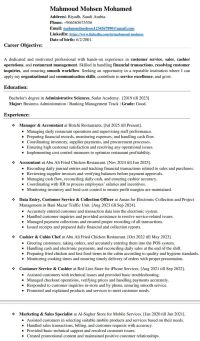 Name Mahmoud Mohsen Mohamed Bahaa El - Din 25 years old Bachelor of commerce degree Egyptian nationality, residing in Riyadh Looking for work in the following fields Customer Service, Banking, Accounting, Data Entry, Public Relations, Administration, Human Resources