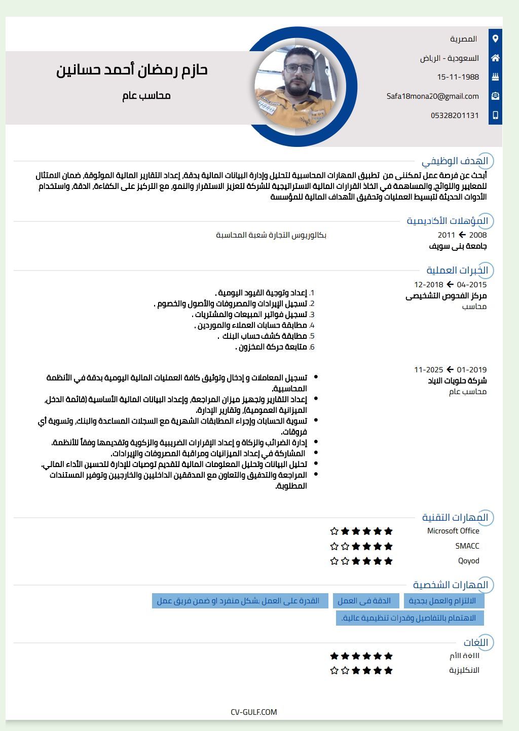 مدير حسابات ملم بكل معايير المحاسبة واعداد التقارير المالية وضريبة القيمة المضافة ومتابعة حسابات الموردين والعملاء واعداد القوائم المالية الختامية وخبرة في كافة البرامج المحاسبية إقامة سارية وقابلة للنقل