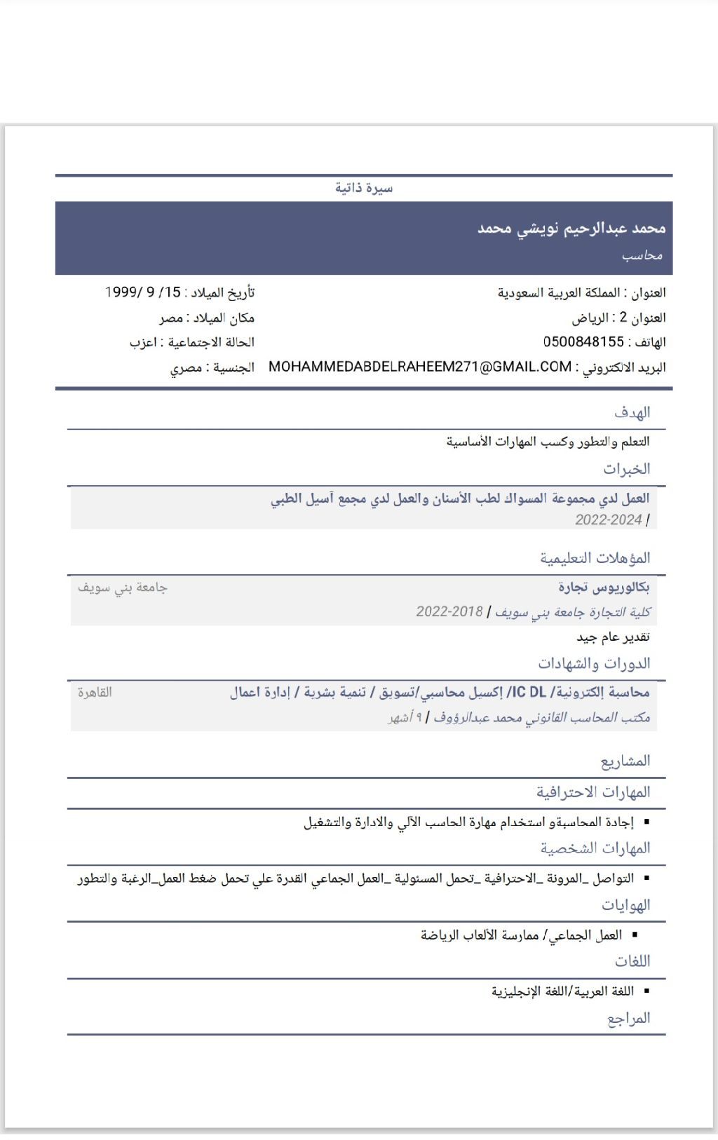 محمد عبد الرحيم نويشي حاصل على بكالوريوس تجارة شعبة محاسبة سبق لي العمل في مجمعات طبية الأسنان والجلدية وسبق لي موظفة استقبال في فندق آفاق ابحث عن فرصة عمل في المجال الطبي كمحاسب أو استقبال إقامة سارية المفعول ويوجد رخصة قيادة ومتاح لمباشرة العمل فورا