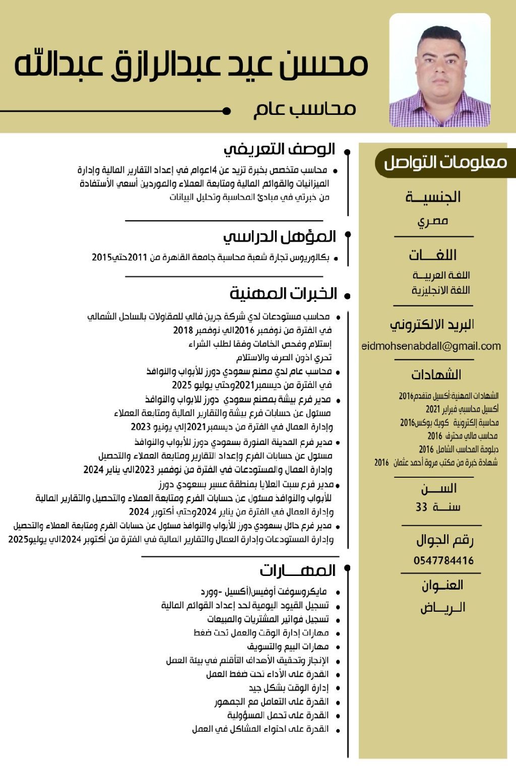 محاسب عام خبرة 4 سنوات داخل المملكة لدي مصنع سعودي دورز للأبواب والنوافذ عملت خلالها في إدارة حسابات الفروع من متابعة العملاء والتحصيل واصدار فواتير المبيعات ومشتريات الفرع ومستودعاته
