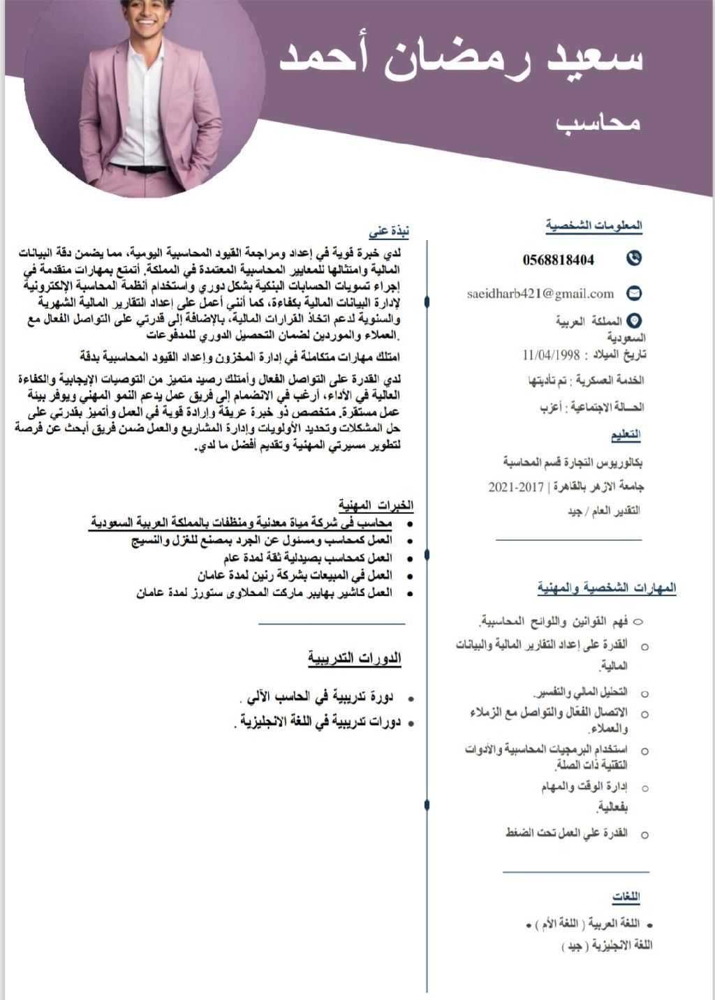 أنا محاسب خبرة من 2019 في الحسابات واشتغلت سيلز موجود حاليا في السعودية رقم