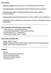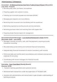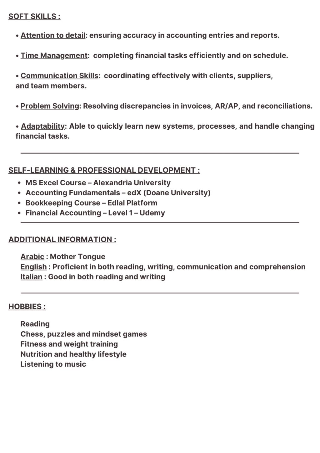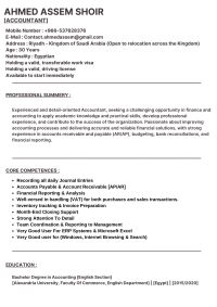 Accountant - with a Bachelor’s in Accounting (English Section) from Alexandria University and over 5 years of experience. Proficient in English in both (Reading - writing - comprehension) Italian, advanced in Excel and ERP systems, and skilled in AR/ AP, journal entries, bank reconciliations, VAT, and financial reporting. Available immediately and willing to relocate anywhere in the Kingdom