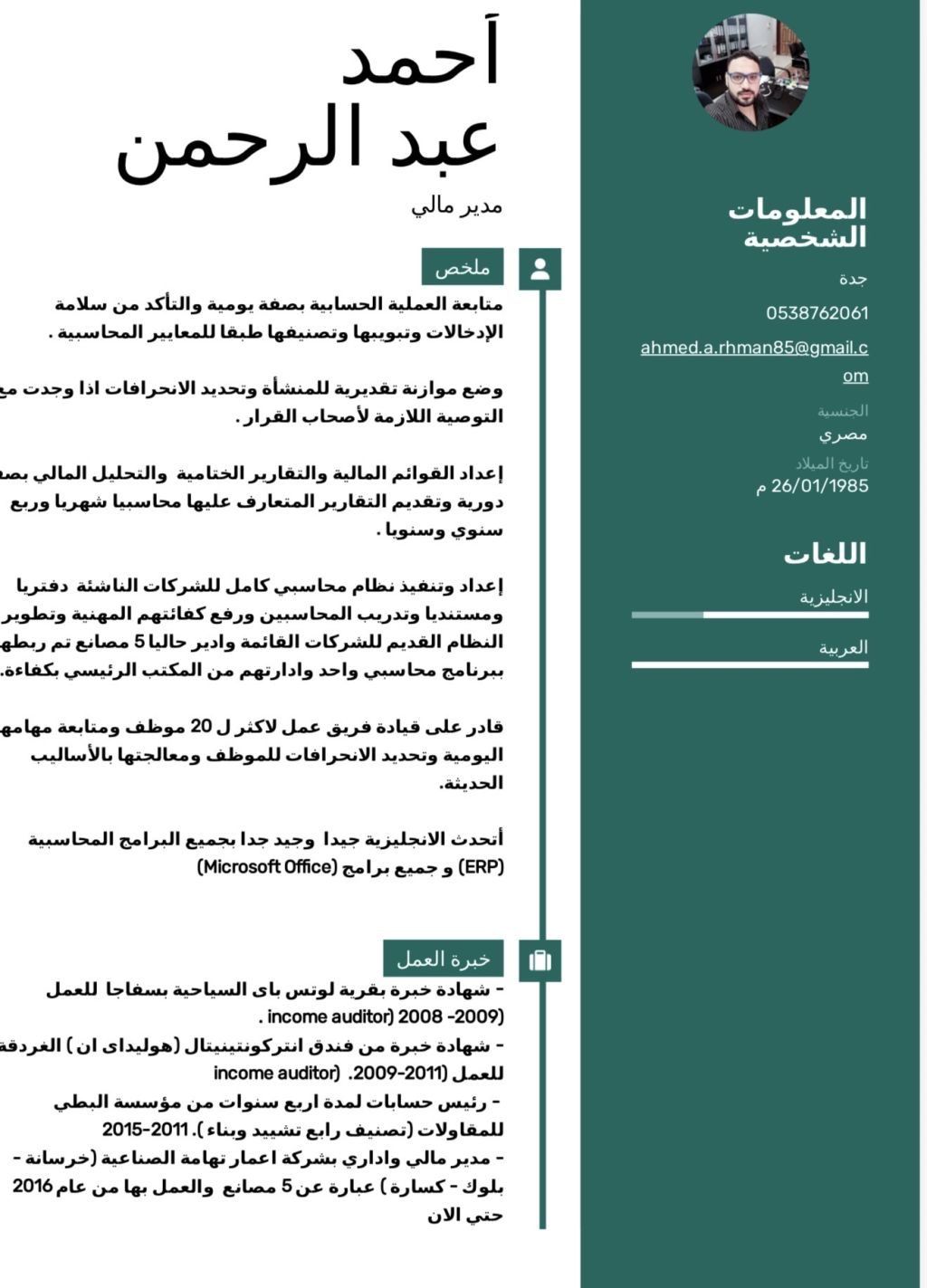 Financial Manager with 19 years of experience in accounting (expertise in taxes, zakat, income, final budget preparation, and monthly and annual reports) including 14 years in Saudi Arabia. Experience in manufacturing, contracting, and hotel sectors. Age 40 years. Available for transfer of sponsorship or without. Has a car and a driver's license