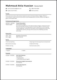 محاسب حديث التخرج اعمل بكفاءة علي البرامج المحاسبية، اعمل علي القيود اليومية وأقفال الحسابات وترحيلها، واعداد القوائم المالية، تدربت في المنشاءات المصرية ومكاتب المحاسبة تحت اشراف محاسبين ماليين ذو خبرة كبيرة، أستطيع العمل علي Microsoft office بكفاءة جيدة، أستطيع العمل في فريق وتحت ضغط وقابل للتطور بشكل كبير، وسريع التعلم والفهم الجيد