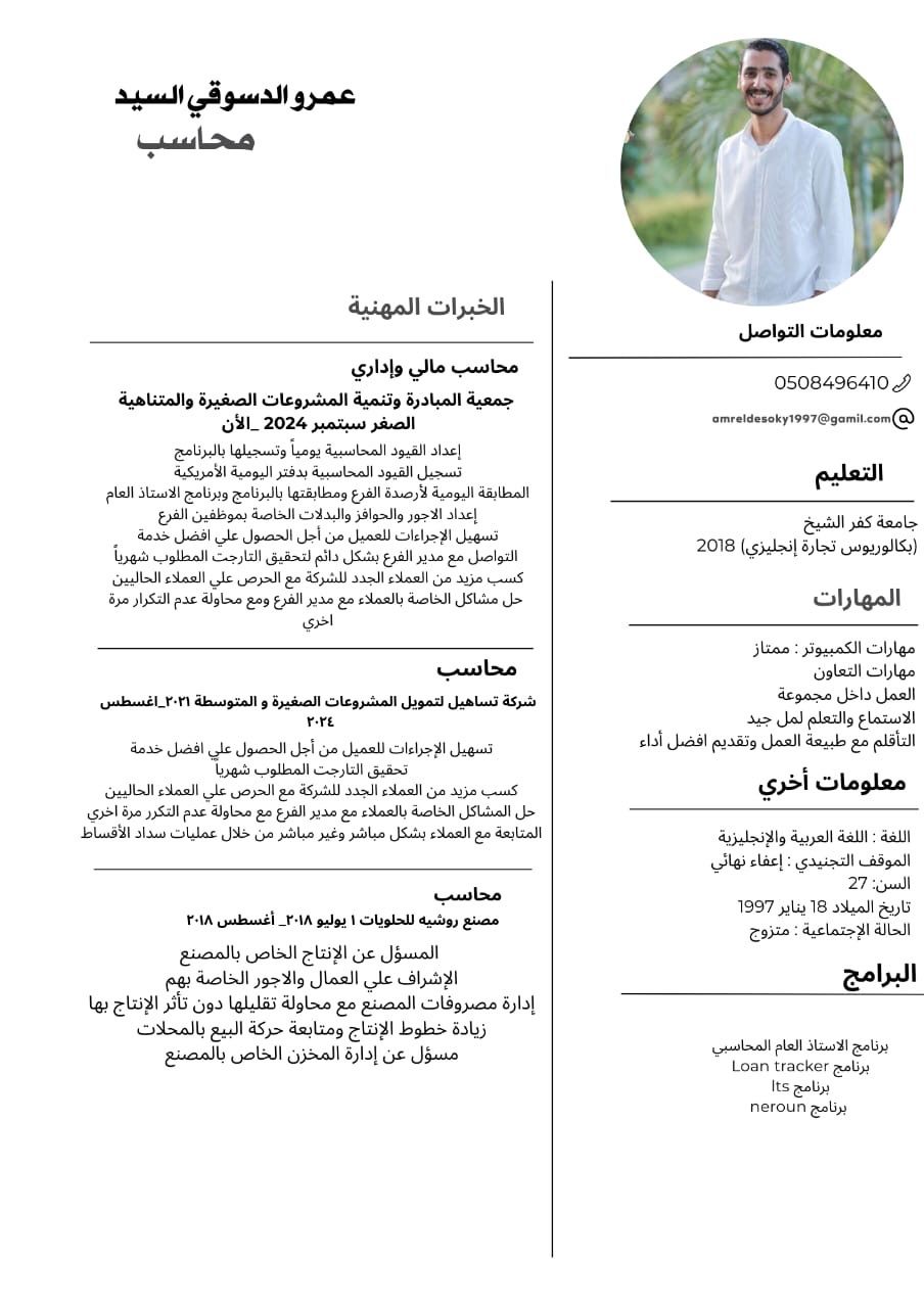 أنا اسمي عمرو الدسوقي ابحث عن عمل سبق ليا العمل في مجال الافتراض والتمويل كما هو موضح بال CV كما سبق وأن عملت ك مشرف عمال مخازن ومراجعة المخزن والصادر والوارد وحاليا أنا مقيم في الدمام ويوجد لدي اقامة سارية لمدة سنة مع امكانية النقل وابحث عن عمل في أي مكان داخل المملكة