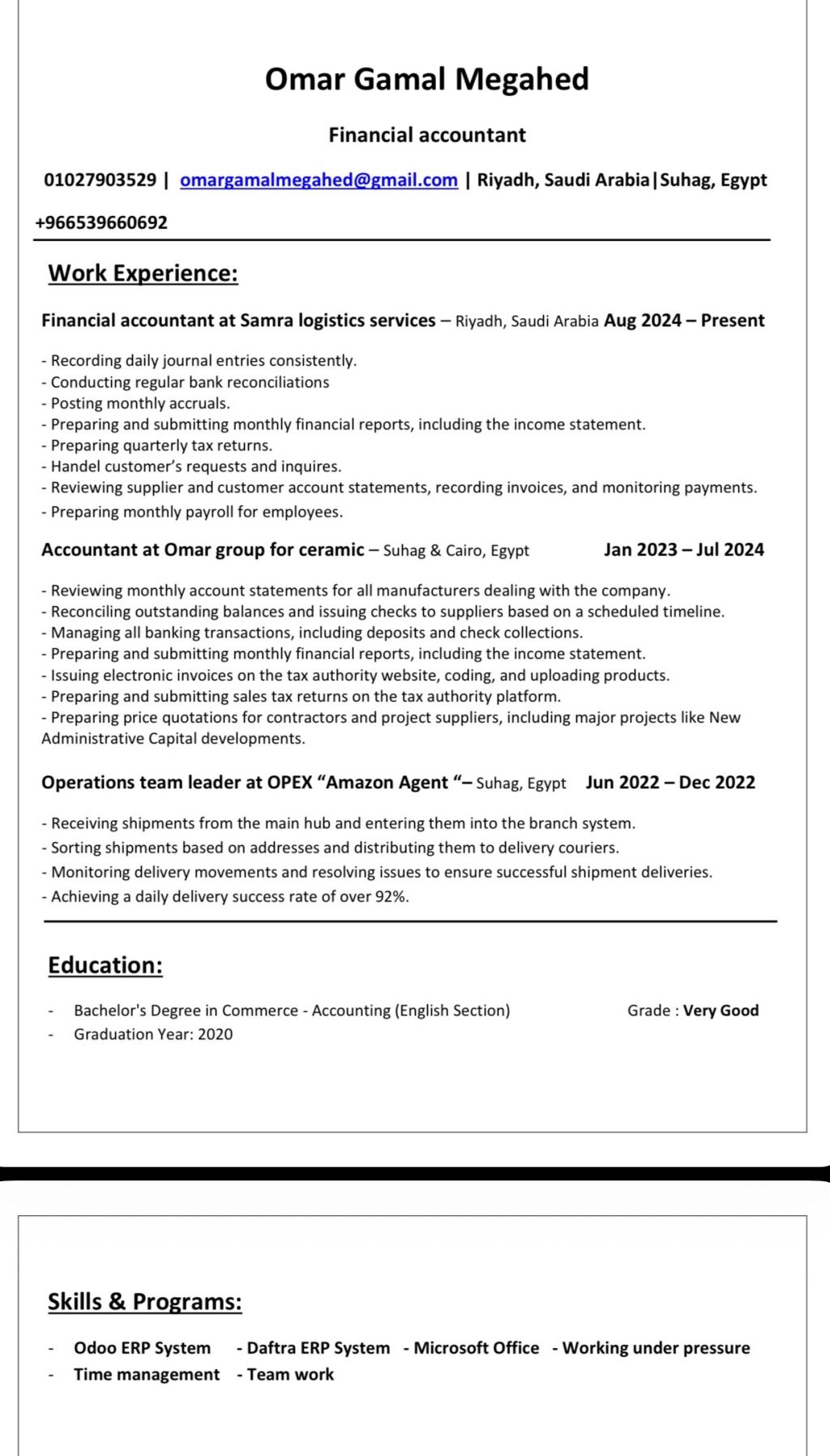 Am omar gamal mgahed, Egyptian accountant am 29 years old and I graduated from faculty of commerce English section with overall grade is very good I have four years experience in accounting and looking for a job as a financial accountant
