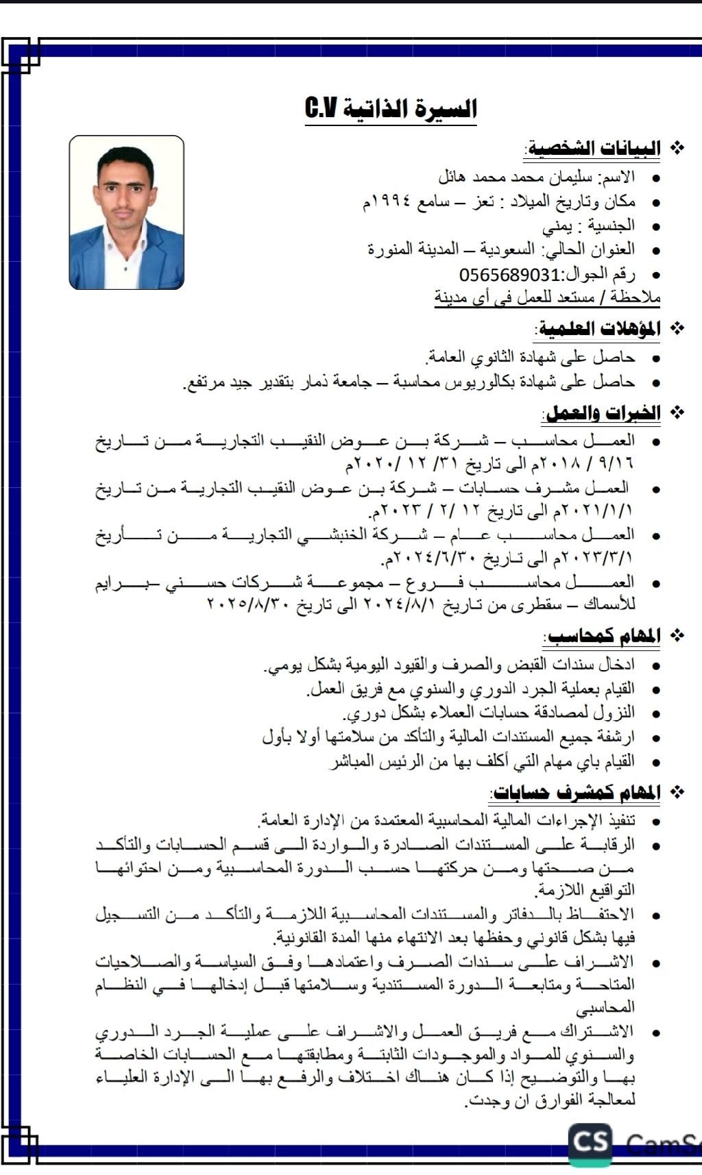 محاسب بدرجة البكالوريوس يمني الجنسية حاصل على شهادة خبرة من عدة شركات بخبرة 7 سنوات في مجال المحاسبة بدرجة مشرف حسابات القدرة على اعداد الاقرارات الضريبة الشهرية أو الربع السنوية اجادة استخدام برامج المحاسبة (مثل Excel، ERP) مهارات عالية في التعامل مع الأرقام والتحليل المالي دقة في العمل، والتزام، وقدرة على العمل تحت الضغط إدارة السجلات المالية اليومية وضبط القيود المحاسبية مقيم في المدينة المنورة