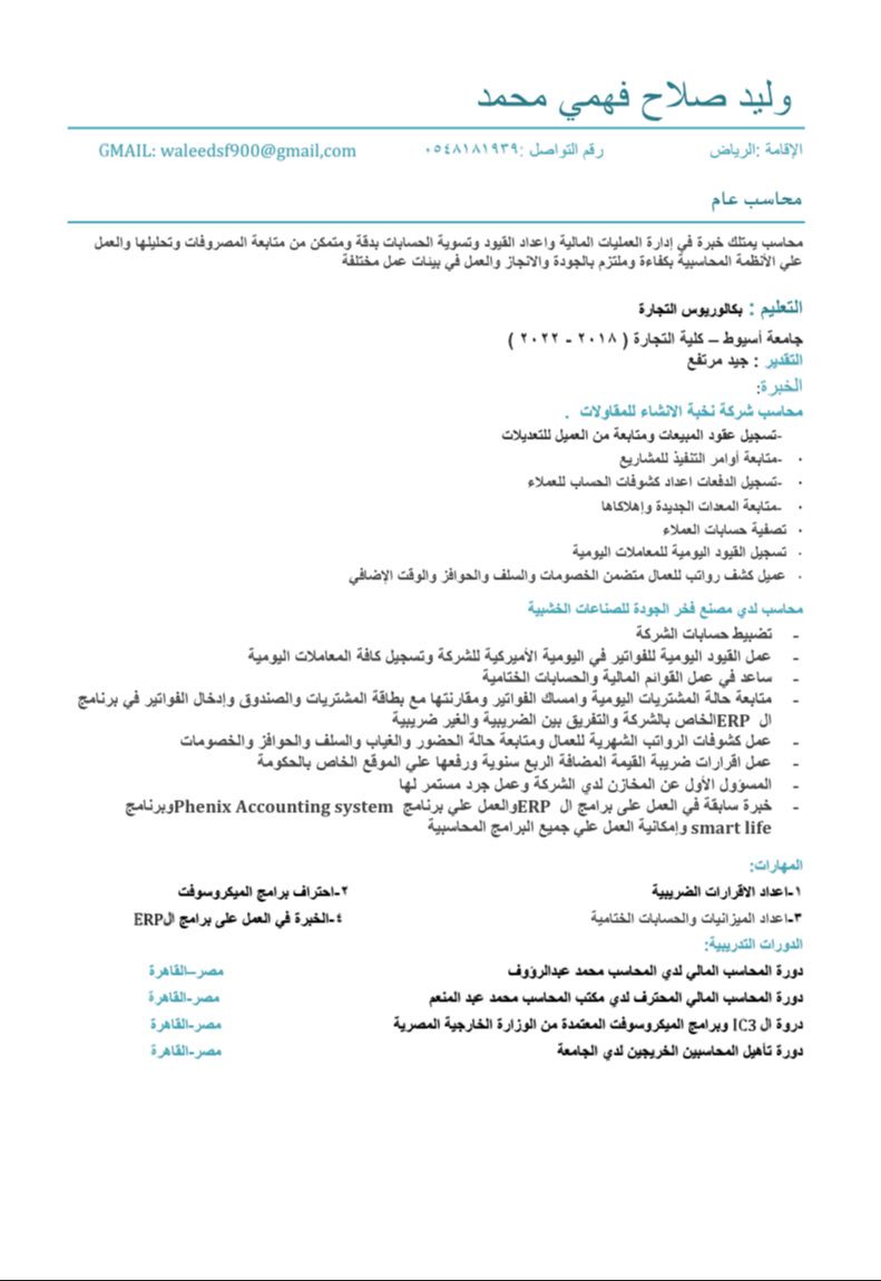 محاسب عام يعمل في المملكة خبرة سنة ونصف بالعمل في المملكة وخبرة سنتين من العمل في مصر ملم بجميع الامور المحاسبية والعمل علي البرامج المحاسبية مثل برنامج Odoo وphenixERP وSmart life ERP وادارة المخازن وأملك المرونة للتعامل والعمل علي جميع البرامج المحاسبية وجميع برامج مايكروسوفت ومعادلات الأكسيل
