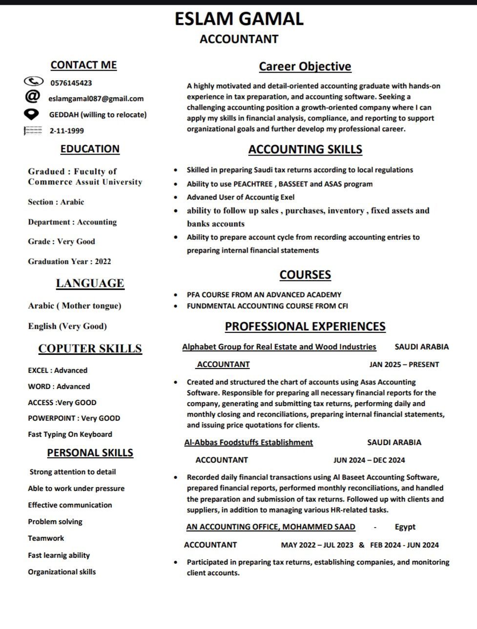 أنا محاسب ابحث عن عمل اضافي كمحاسب ولدي القدرة اعداد الاقرار الضريبي وتأسيس شجرة الحسابات وتسجيل العمليات الماليه بالقيد المحاسبي ومتابعة حسابات العملاء والموردين والمخزون وابداء الرأي للادارة لأخذ القرار الرشيد كما لدي القدرة علي العمل كثير من المنصات الحكوميه مثل ابشر وقوي وفسح وتأميني والغرف التجاريه ومدد والغذاء والدواء وغيرهم الكثير