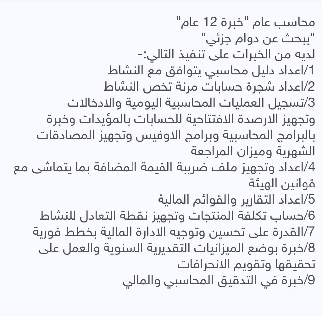 محاسب عام خبرة 12 عام متواجد في أبها يبحث عن عمل متاح نقل كفالة خبرة في تأسيس الحسابات والتسجيل واعداد الاقرار الضريبي والزكوي وخبرة بالبرامج الأوفيس والبرامج المحاسبية حيث عملت في مجال المطاعم والأغذية والمشروبات والفنادق والمقاولات والمراجعة واعداد التقارير المالية بناء على المعايير الدولية والتحليل المالي ودعم الادارة في اتخاذ القرارات المهمة وتنفيذ السياسات المالية والعمل على جودة العمل