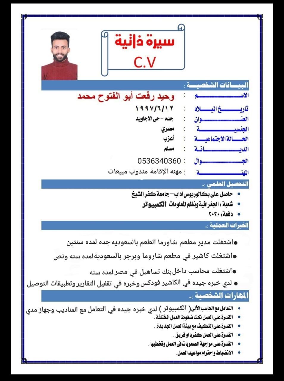 ابحث عن عمل اشتغلت محاسب وعندي خبرة كويسه في الجهاز حق الكاشير اللي هوا فودكس وكمان خبرة في البرامج اللي هيا التوصيل زي هنجرستش وتويوا ومرسول وتقفيل التقارير وتقفيل الحسابات حقت المطعم وفواتير المناديب ومرجعتها بدقة ومرجعت المنتج