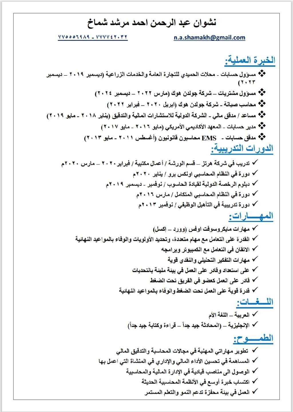 Financial Accountant and Auditor (Yemeni National) Note I will be available in the Kingdom of Saudi Arabia (KSA) by the end of the year with a valid residency (Iqama)