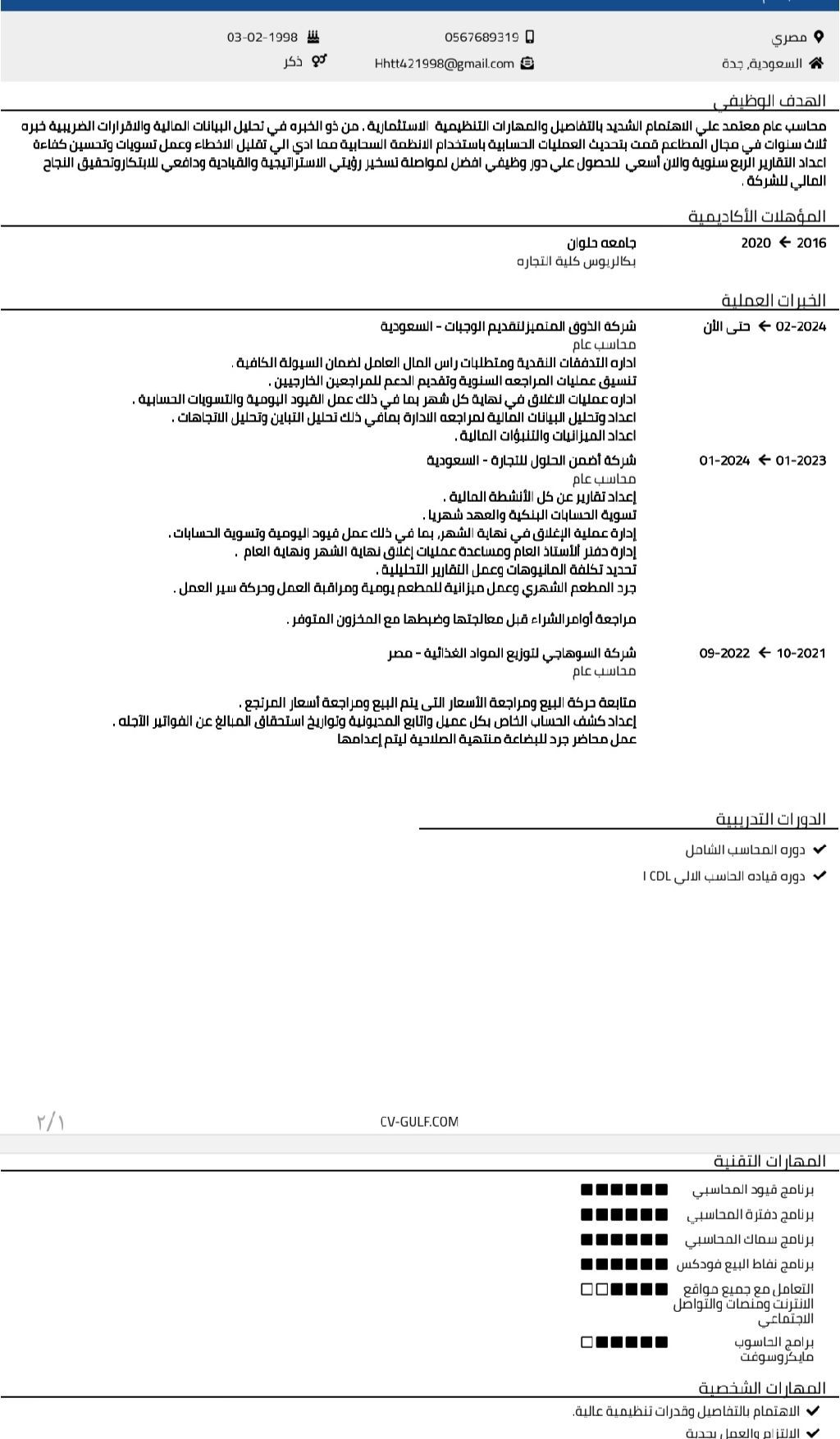 محاسب عام مجال المطاعم بخلفية مهنية قوية وخبرة 3 سنوات في إدارة الدورة المحاسبية أقدم خدماتي المحاسبية لضمان دقة البيانات المالية ودعم اتخاذ القرار. إدارة الدورة المحاسبية من تسجيل القيود اليومية حتى اعداد ميزان المراجعة. الخبرة التقنية احتراف لبرنامج Excel (Advanced) والعمل على الأنظمة المحاسبية السحابية وERP (مثل I max. دفتره. قيود. أسماك) التسويات والتدقيق مطابقة كشوف الحسابات البنكية