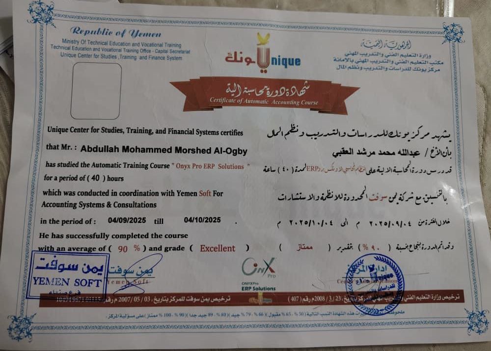 عبدالله محمد العقبي، يمني الجنسية، بكالوريوس محاسبة، كلية التجارة والاقتصاد، جامعة صنعاء. حاصل على العديد من الدورات التدريبية في الأنظمة المحاسبية، منها نظام الأونكس برو Onyx Pro ورخصة قيادة الحاسوب. مكان الإقامة الحالي الرياض، قابل للعمل بأي منطقة في المملكة