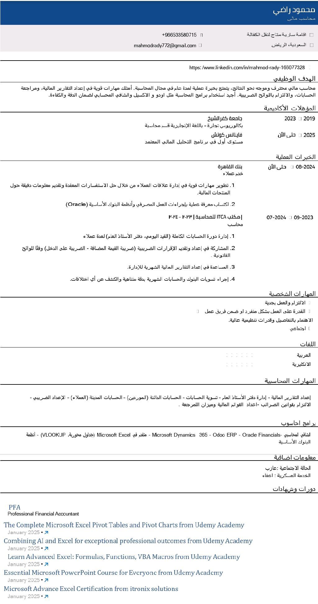 محاسب مالي محترف وموجه نحو النتائج، يتمتع بخبرة عملية لمدة عام في مجال المحاسبة. امتلك مهارات قوية في اعداد التقارير المالية، ومراجعة الحسابات، والالتزام باللوائح الضريبية أجيد استخدام برامج المحاسبة مثل أودو الأكسيل والشافي المحسابي لضمان الدقة والكفاءة
