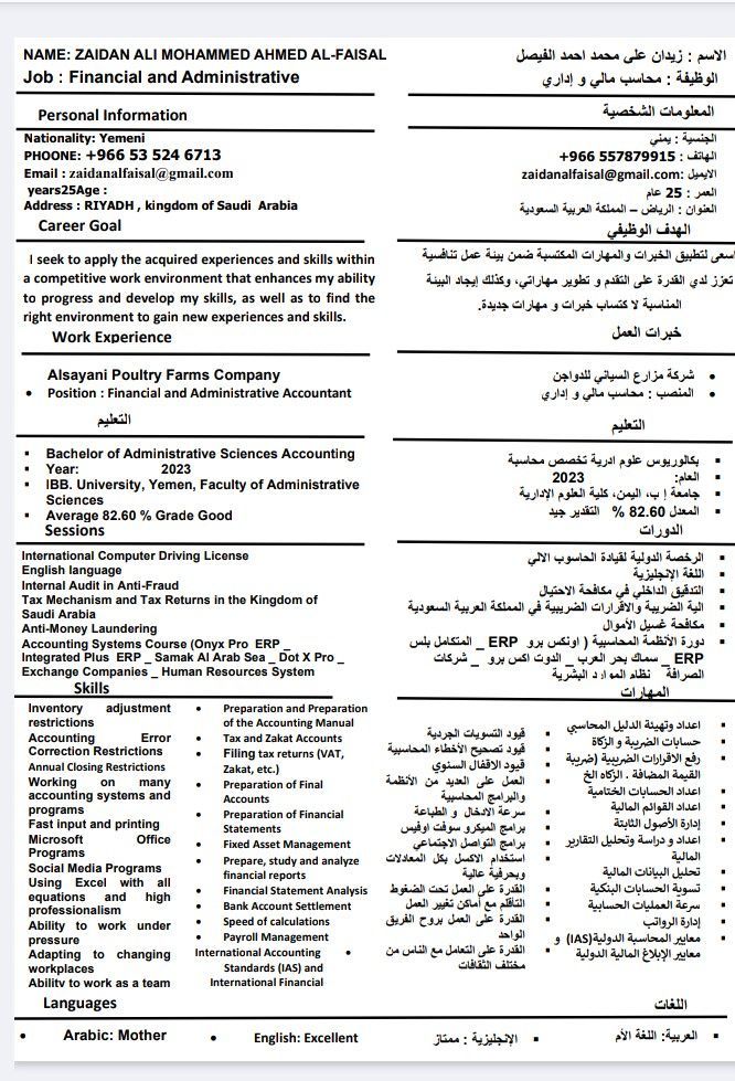 محاسب محترف يمني الجنسية ابحث عن فرصة عمل في مجال المحاسبة. حاصل على بكالوريوس في المحاسبة مع خبرة في نفس المجال مهاراتي تشمل إدارة الحسابات اعداد التقارير والتحليل المالي. أتمتع بالدقة والقدرة على العمل تحت الضغط