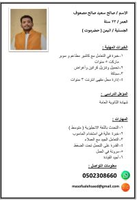 My name is Saleh Saeed, I am from Yemen (Hadhramaut) I am 23 years old, and I am looking for a job. I have extensive computer skills and experience as a cashier in restaurants and supermarkets. My education level is high school diploma, and I have a valid residency permit. My CV is attached it contains everything you need to know about me. I can speak English (intermediate level) I also have exper