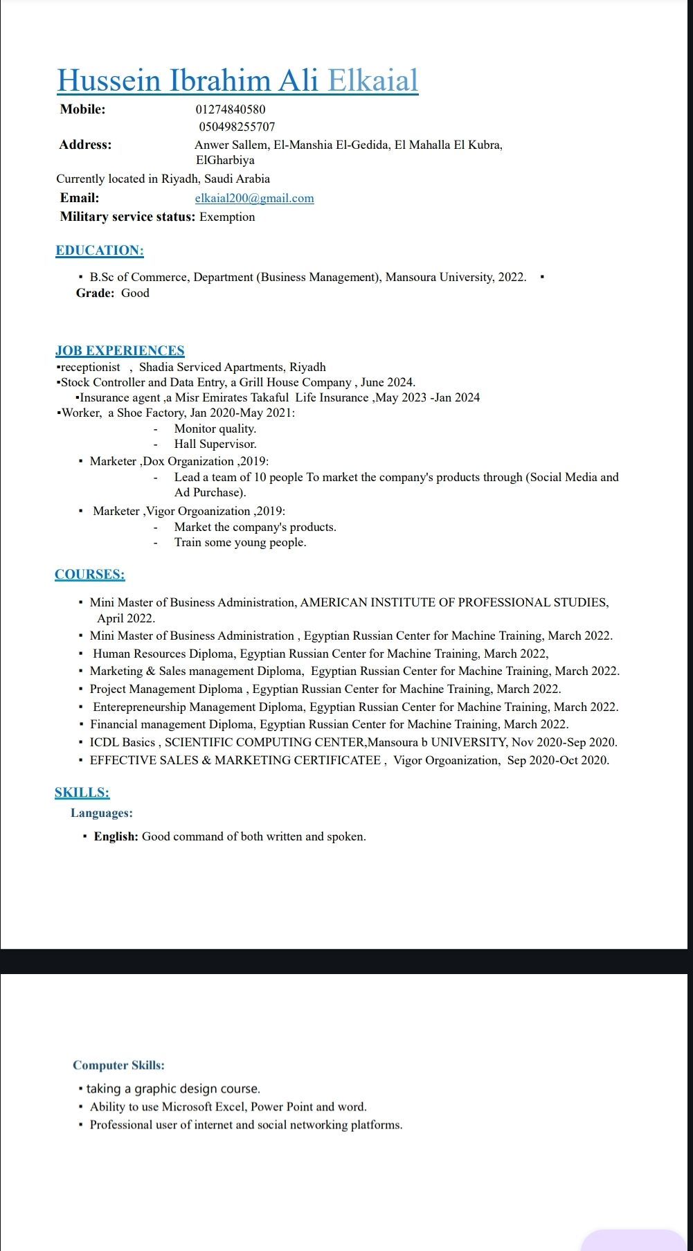 I am an Egyptian living in Al - Janadriyah district, Riyadh. I am 25 years old and looking for a job as an accountant. I am available for sponsorship transfer