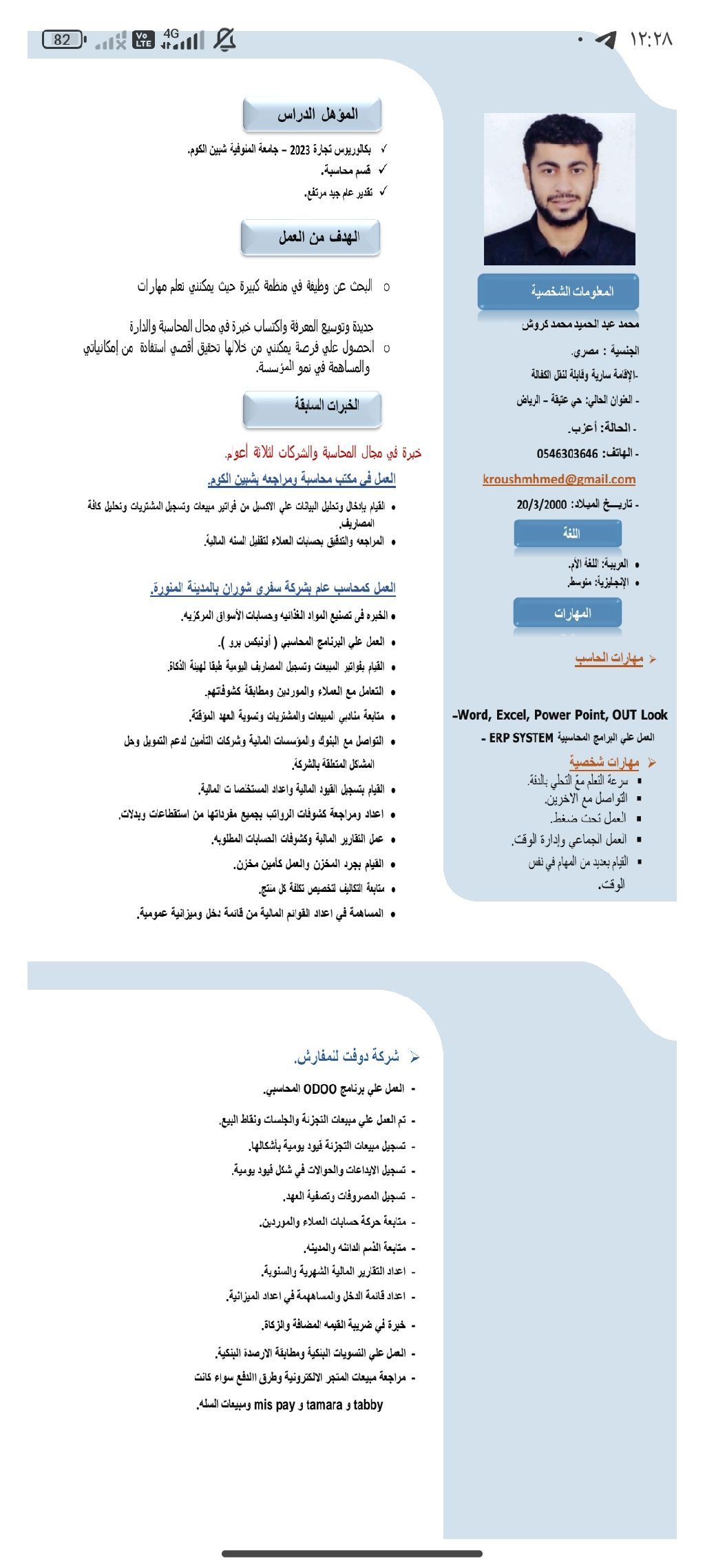محاسب عام إقامة سارية وقابلة للتحويل ابحث عن فرصة عمل لدى خبرة 3 سنوات في الحسابات في المصانع والشركات التجاريه أجيد اعداد التقارير الماليه متابعه الحسابات اليوميه بدقة عالية متابعه حسابات العملاء والموردين وحركة الصناديق وتصفية العهد ومطابقه وتسوية البنوك وضريبة القيمة المضافة أجيد برامج الأوفيس وبرامج أونكس برو وبرنامج الأودو