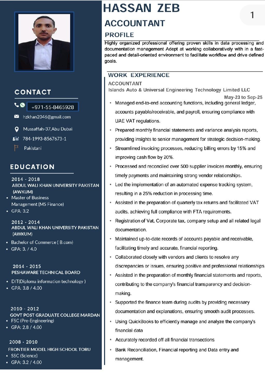 My name is Hassan zeb, I did my MBF Finance 18 year of education, living in Abu Dhabi Mussafah, looking for an opportunity related to Account and Finance, I have total 6 year of experience 3 year of United Arab Emirates and 3 year in Pakistani. will relocate anywhere for Job, as a general accountant I can do all relevant work, also as a assistant Auditor, using Quickbooks and zoho books software