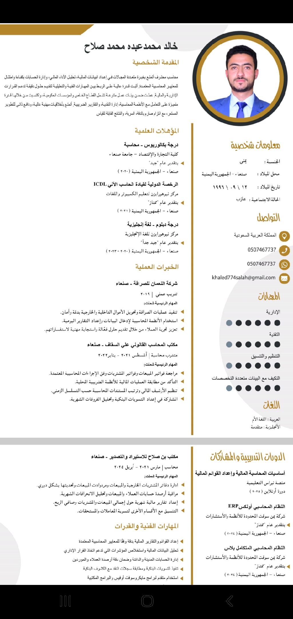 محاسب يبحث عن فرصة عمل - خبرة 3 سنوات محاسب ذو خبرة عملية تزيد عن 3 سنوات في المحاسبة المالية والادارية، ابحث عن فرصة عمل مناسبة داخل المملكة العربية السعودية. المهارات اعداد القيود اليومية والتسويات البنكية اعداد التقارير المالية الشهرية والسنوية إدارة الرواتب والمصروفات التعامل مع Excel باحتراف متابعة الذمم المدينة والدائنة الالتزام والدقة التعامل مختلف مع المنصات الحكومية الالتزام والدقة