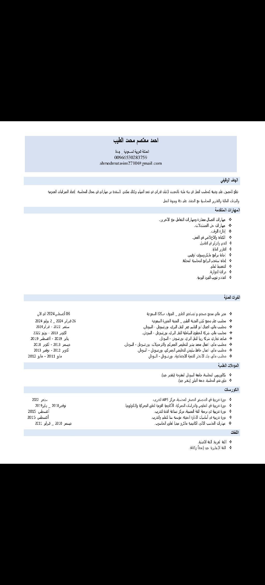 محاسب مالي خبرة أكثر من 12 عام مقيم في السعودية واعمل أكثر من سنتين لدي خبرة في عديد من الأنظمة المحاسبية وعملت في شركات نقل تر ليات ومكاتب تخليص جمركي والمجمعات الطبية وجاهز لنقل الكفالة